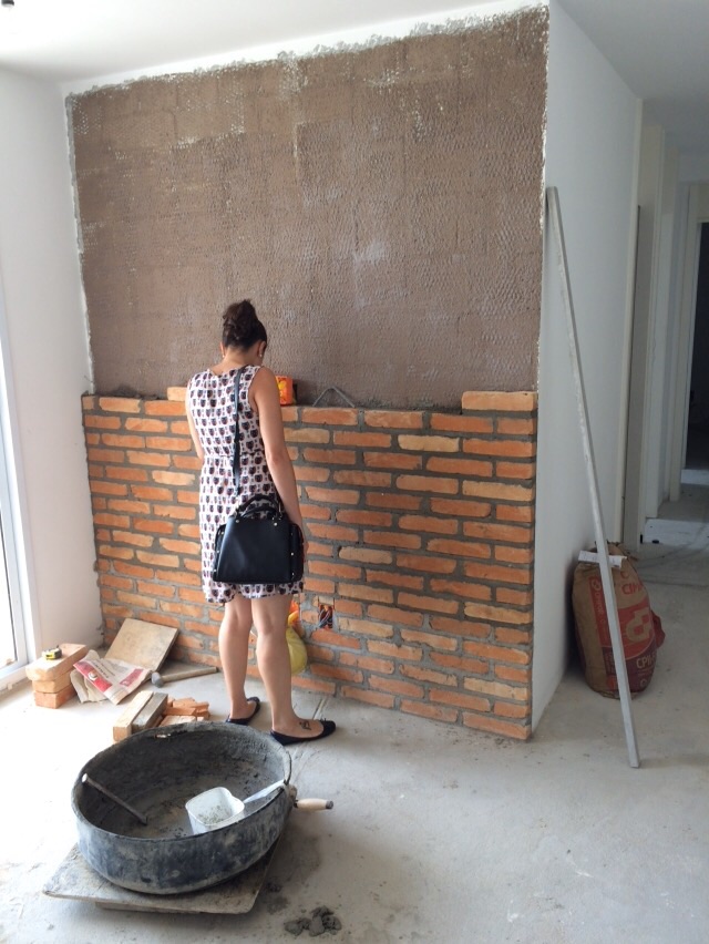 A parede de tijolinhos foi a primeira coisa que decidimos que faríamos no apê. Queríamos um clima de casa no campo, bem aconchegante no nosso apartamento.