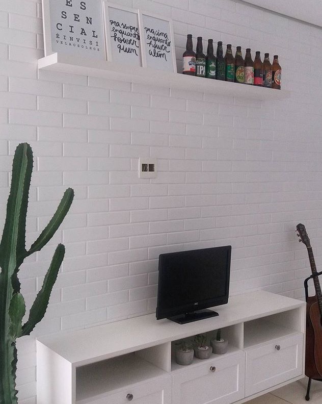 A casa deles é linda, tem 63 m², dois andares e uma cozinha inspirada no @apto.21 . Além disso, tem parede de tijolinho aparente, vasinhos de cimento e um cacto gigante. Isto é, tudo o que gostamos!