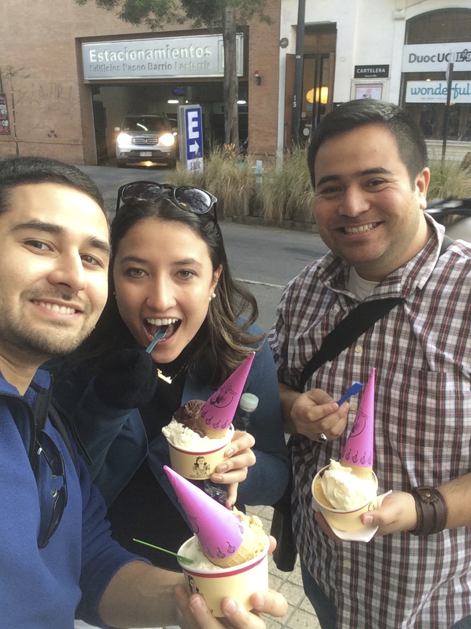 Chegamos na capital chilena de madrugada e dormimos na casa de um primo meu. Para quem não tem parentes no Chile indicamos ficar em um hotel no bairro Bela Vista ou Providencia, próximos ao centro. No dia seguinte, acordamos bem cedo e fomos caminhando para o centro. Lá visitamos La Moneda, Plaza de Armas e todo centro cultural incluindo as catedrais e prédios do governo. Almoçamos no Mercado Central, onde tem as famosas centollas (caranguejo gigante). Aqui uma dica: a centolla inteira é extremamente cara, procure um prato que contenha também carne de centolla, fica muito mais barato e você degusta da mesma forma. Depois do almoço, conhecemos uma gellateria artesanal chamada Empório La Rosa, na qual experimentamos sabores únicos de sorvetes. Se for lá, não deixe de provar os sabores: Rosas, Tangerina e Chocolate Amargo. Seguimos por Providência até chegar em La Chacona, uma das casas do poeta Pablo Neruda. Para finalizar o dia, subimos o cerro Santa Lucia e fomos contemplados com uma vista linda da cidade e da Cordilheira dos Andes.