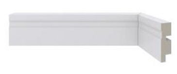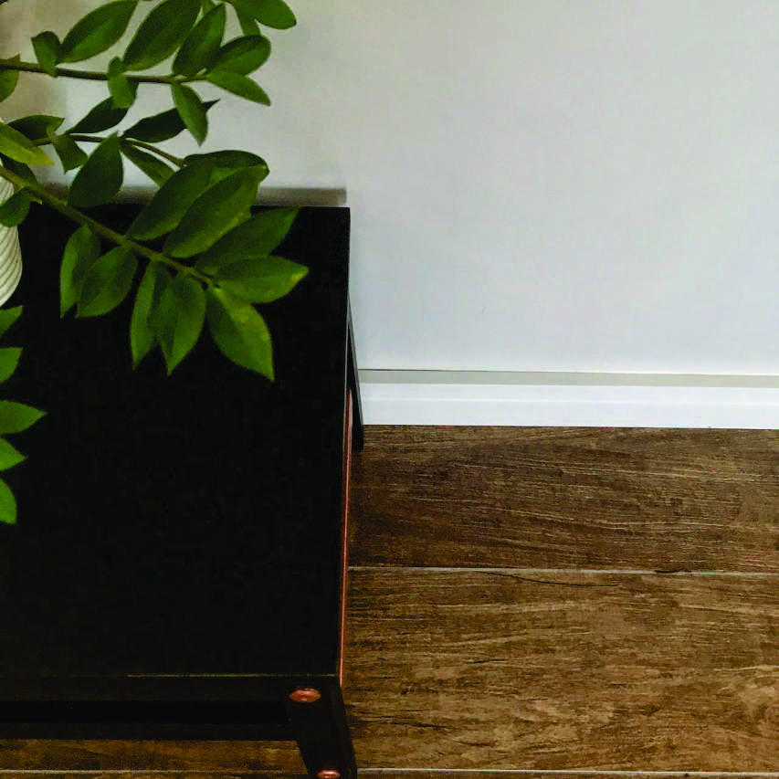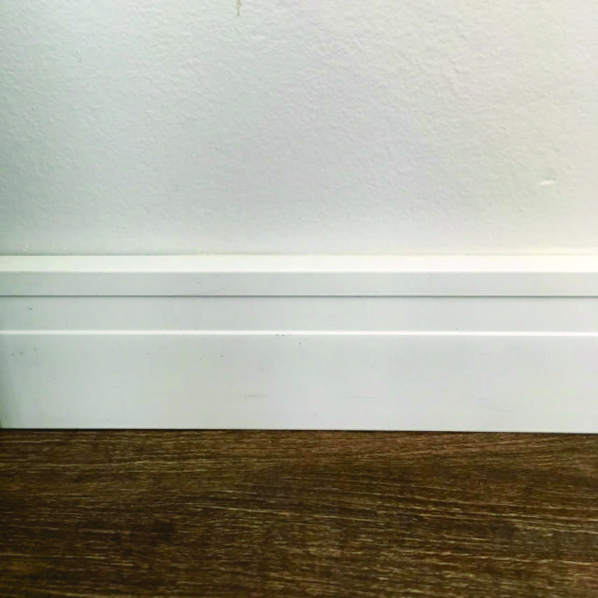 Quando decidimos o estilo de rodapé que gostaríamos, começamos as pesquisas para saber as opções do mercado, porque a verdade é que não entendíamos nada dessa parte. Encontramos na Leroy Merlin uma opção da marca Santa Luzia que é de um material chamado poliestireno que não mofa e não sofre com cupins por ser um tipo de plástico reciclado.