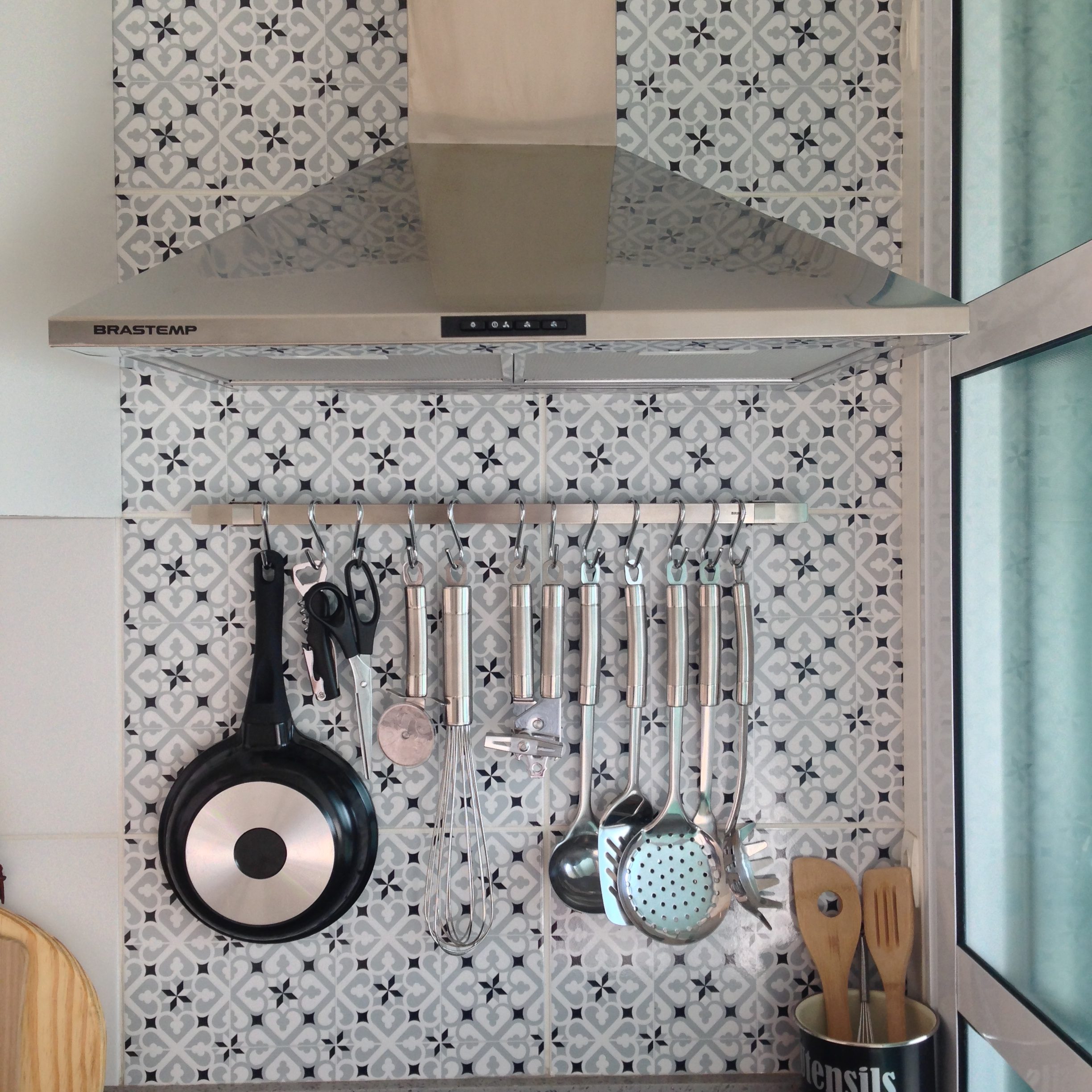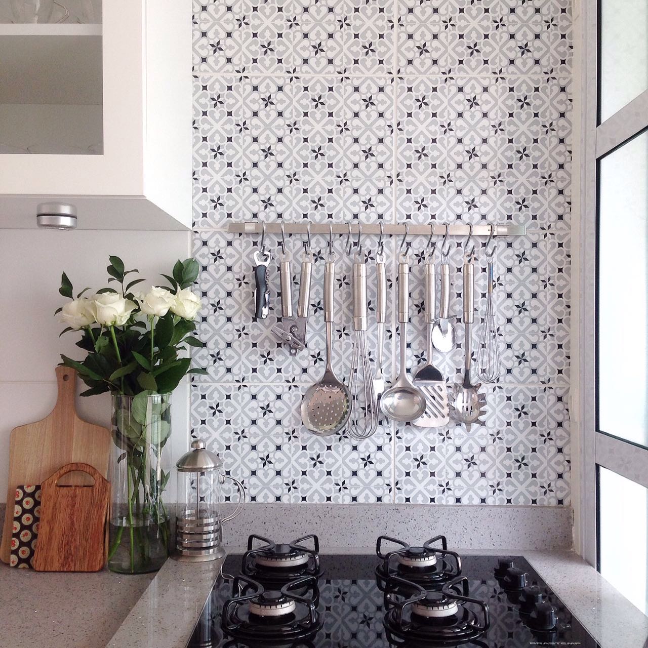 Depois de algumas informações técnicas dos lugares que queríamos personalizar, chegamos na opção de adesivos vinílicos. Para a cozinha, optamos por um adesivo que imitasse azulejo/ladrilhos. Em cima de um modelo de inspiração, eles criaram uma arte nas cores e tamanho do revestimento já existente em um adesivo transparente que possui uma camada de verniz de proteção para não desbotar ou arranhar com facilidade quando limpar – apenas com água e detergente.