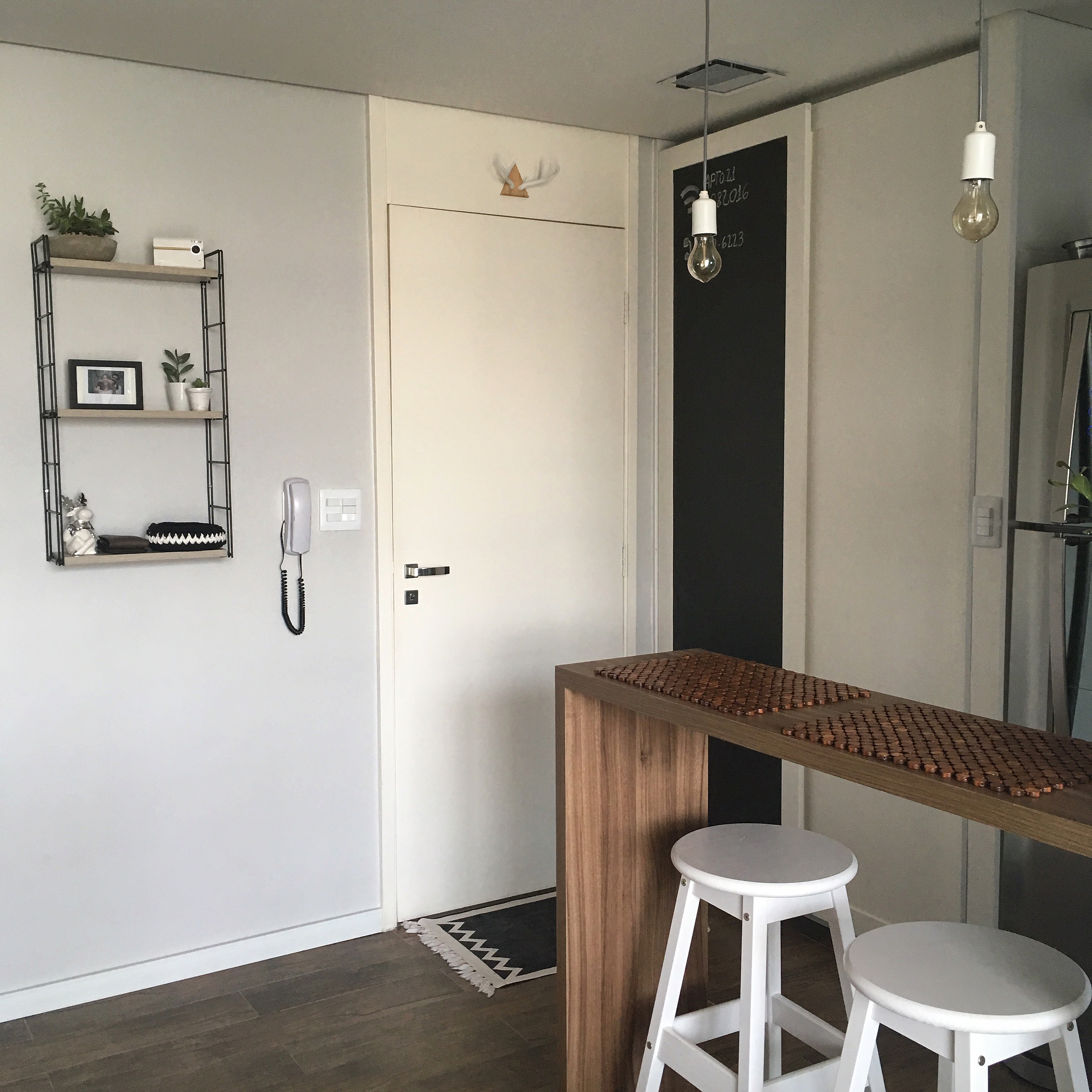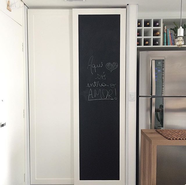 Iniciamos a parte de adesivos dessa forma no apto.21, mas não paramos por aí. Uma seguidora do Instagram nos deu a ideia de colocarmos uma lousa na porta da despensa, onde poderíamos anotar recados, listas de compras, senha do wifi para os amigos…. Nessa porta, eles usaram um outro adesivo preto fosco onde podemos usar giz e apagar depois com um pano!