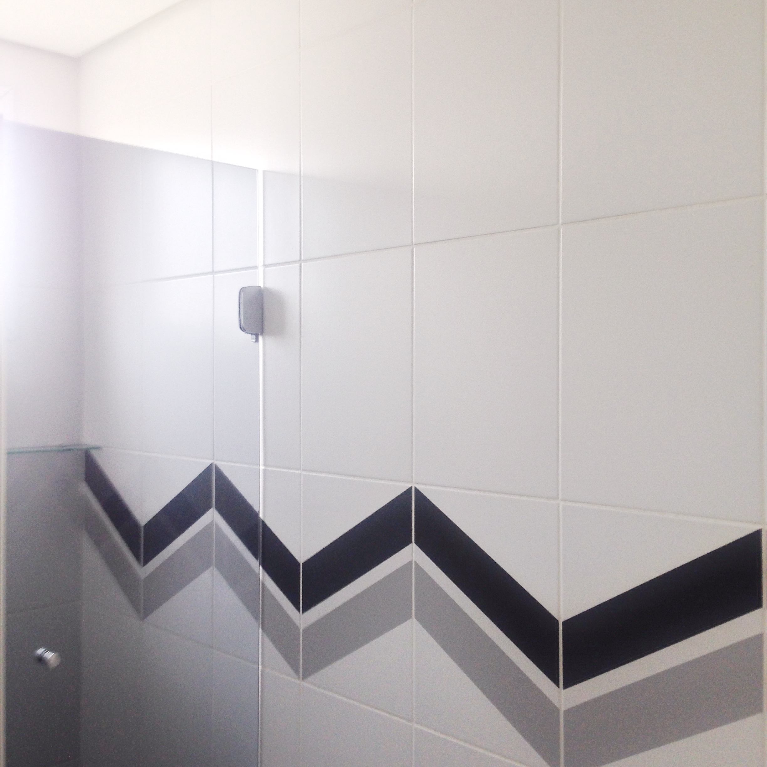 No nosso banheiro – da suíte máster hehehe –, eles usaram um adesivo que já vem nas cores que escolhemos, um cinza escuro e outro mais claro, e que também já veio cortado no tamanho do azulejo.