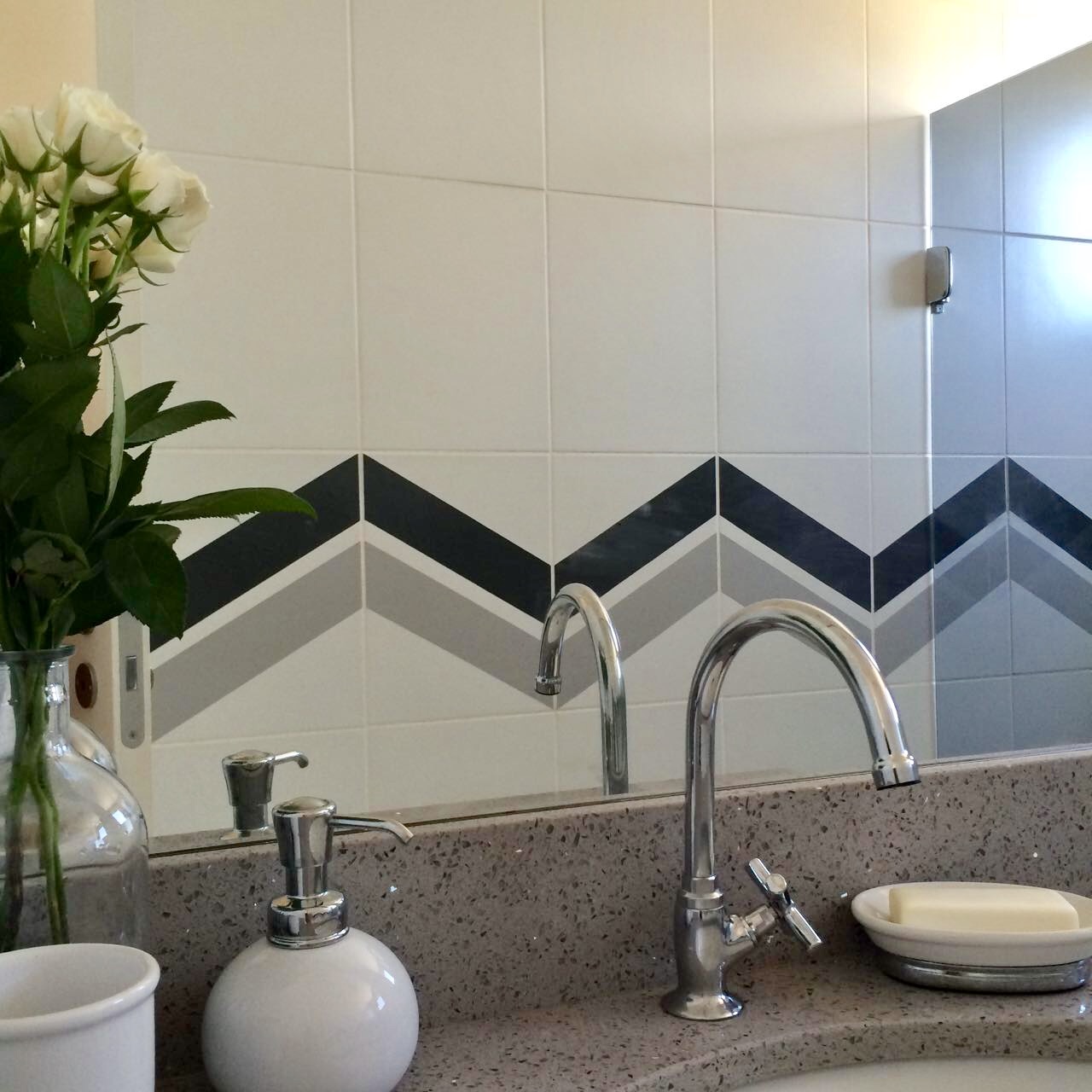 No nosso banheiro – da suíte máster hehehe –, eles usaram um adesivo que já vem nas cores que escolhemos, um cinza escuro e outro mais claro, e que também já veio cortado no tamanho do azulejo.